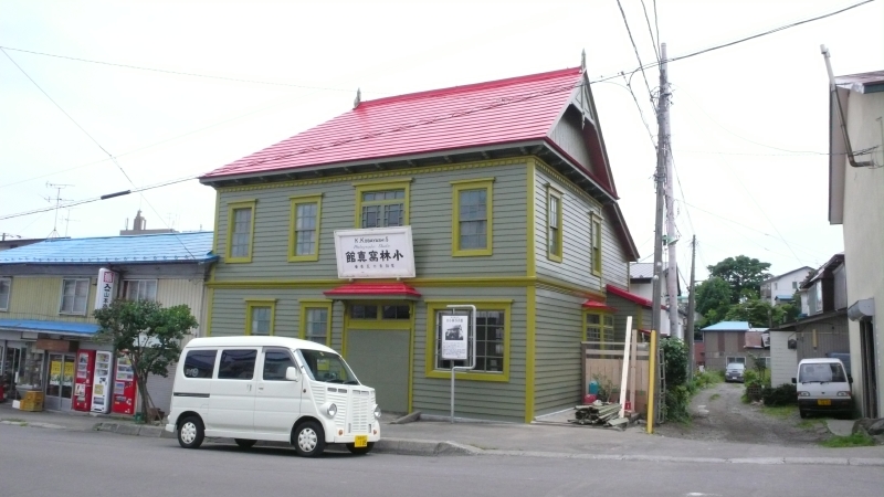 交差点をすぎ、大型薬局の手前信号のある交差点を左折しますと緑の外壁に赤い屋根の建物が「旧小林寫真館」です。